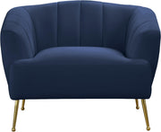 Dress up your living room space with this Tori Velvet Chair. This plush chair features sleek navy velvet upholstery that covers every square inch, adding a sumptuous and svelte look to your room. The gold legs with a ball design on the foot adds to the elegant look of this pretty chair, and deep channel tufting adds loft to the back and arms for a lavish feel when you sit down to relax and unwind at day���s end.