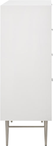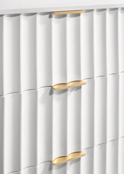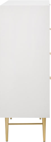 Embody industrialist style with this Modernist chest in a white medium gloss finish. Utilitarian but sculptural in design, this piece features a ridged, textured look that is chic but sleek. It rests on brushed gold steel legs and has gold brushed handles for a bit of regality. Combine this piece with other items in the Modernist lineup for a cohesive finish to your room makeover.