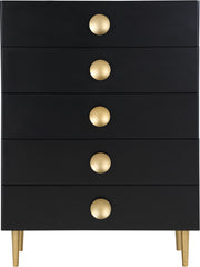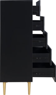 Watch your d?�cor cascade to new heights when you bring home this Zayne chest. It features a rich black finish that sets an instant contemporary vibe in your space. Its brushed gold metal legs and handle add a sophisticated slant to the piece���s design, ensuring it���s a simple and easy fit with other modern pieces. Pair this unit with other items in the Zayne collection for a seamless presentation in your room.