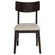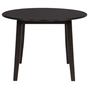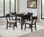 Gracefully tailored for intimate meals and lingering conversation, this five-piece round dining set brings charm and function to the heart of your home. The drop-leaf table blooms with ease, offering flexibility for everyday dining or special moments. Each chair cradles you in comfort with its curved backrest and plush ivory seat. Rich in dark coffee tones and crafted from rubberwood, mango, and engineered wood, it weaves elegance and warmth into every shared gathering. Key Features: • Five-piece round dining set with drop-leaf table for casual and expanded dining use • Dark coffee wood finish lends richness and warmth to compact dining spaces • Drop-leaf top folds down to conserve space when not in use • Chairs feature gently curved backs and soft cushioned seats in ivory fabric • Crafted from rubberwood, mango, engineered wood, foam, and fabric upholstery • Perfect for cozy kitchen corners, apartments, or breakfast nooks