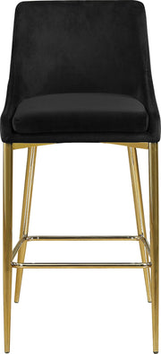 Yield to your contemporary side with this Karina Black Velvet Stool. This modern stool is counter height, making it an ideal addition to a home bar or eat-in kitchen counter. The black velvet upholstery brings a neutral element to your room, so it can easily meld with other furnishings. Plump seat and back cushions ensure that guests sit comfortably, whether they're enjoying a sudsy brew or a stack of pancakes. The polished gold metal frame is sturdy and stout, adding a durable slant to this lovely stool.