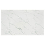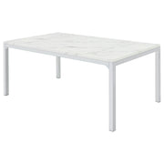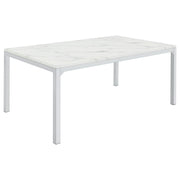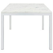 Dress up a dining room with striking, modern opulence. This gorgeous, contemporary dining table flaunts a smooth, white, marble top for a luxurious design that's sure to impress. The table base is made with top-quality metal in a gleaming chrome finish that shines in the light. From everyday dinners to elaborate feasts, the rectangular surface provides all the space you need for family dining enjoyment. Surround this modern table with your favorite chairs to complete a formal dining room in style. Key Features: • Rectangular dining table with spacious top and modern linear frame design • Faux Carrara marble finish adds a refined look with subtle veining across the surface • Sleek chrome metal legs provide sturdy support with high-shine appeal • Clean edges and minimalist profile complement contemporary dining spaces • Made from engineered wood with durable PVC laminate and metal framing • Assembly required with smooth finish ideal for both casual meals and formal occasions