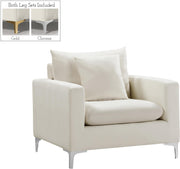 Curl up with a good book from the welcoming confines of this Naomi Cream Velvet Chair. The color of this chair adds a bold touch to your decor and shakes up otherwise neutral color schemes. Plush velvet material feels cozy and comfortable against your skin, while deep seat cushions provide lots of room for you to stretch your legs. This chair comes with both gold and chrome legs, so you can customize its look to meet your decor plans. Pillows are included for added homey warmth and comfort.
