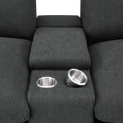 This three-seat home theater seating set combines modern convenience with plush comfort. Each power recliner offers smooth adjustability, while two center consoles feature lift-top storage and dual stainless steel cup holders. Upholstered in soft fabric, the generously padded cushions and pillow-top armrests enhance relaxation. Built for durability and long-lasting support, this seating arrangement is perfect for creating a cozy entertainment space.
