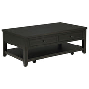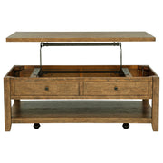 Blending versatility and warmth, this lift-top coffee table brings function and charm to everyday living. Its clean, structured silhouette is elevated by a spacious tabletop that rises for dining or work, while interior storage keeps essentials neatly tucked away. A wide lower shelf adds room for display or baskets, and built-in casters ensure effortless mobility. Crafted from pine, veneer, and engineered wood, it offers grounded style with everyday flexibility. Key Features: • Lift-top coffee table with concealed storage and lower shelf for flexible organization • Distressed brown finish reveals warm wood grain with a classic rustic tone • Top surface lifts for dining or laptop use, then lowers smoothly into place • Built-in casters provide seamless mobility for rearranging or cleaning • Black hardware adds a touch of contrast to the rich wood finish • Crafted from pine, pine veneer, and engineered wood for lasting strength