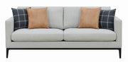 You and your loved ones will be lounging in style on this chic, comfortable sofa. With its understated, transitional design, it blends seamlessly with the decor of any living room. Soft, grey upholstery subtly plays up its simple silhouette. Two matching accent pillows add an exquisitely inviting touch. Complete with soft, plush seat cushions, this sofa takes comfort to the next level.