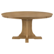 Blending traditional lines with a relaxed, natural finish, this round dining table offers a timeless foundation for mealtime gatherings. A sixty-inch white oak veneer top sits above a sculpted pedestal base crafted from solid rubberwood and engineered wood. The light brown tone showcases the wood’s character while enhancing its versatility across casual and transitional settings. Designed for everyday use, it combines craftsmanship with subtle elegance. Key Features: • Round dining table features a wide white oak veneer top in a natural light brown wood finish • Sixty-inch diameter surface comfortably accommodates family meals or larger gatherings • Sculpted pedestal base with bracket-style feet adds visual interest and sturdy support • Finish highlights the organic grain variations of white oak veneer for a warm, rustic touch • Crafted from solid rubberwood, engineered wood, and white oak veneer for lasting reliability • Timeless form pairs well with traditional, rustic, or transitional dining room styles