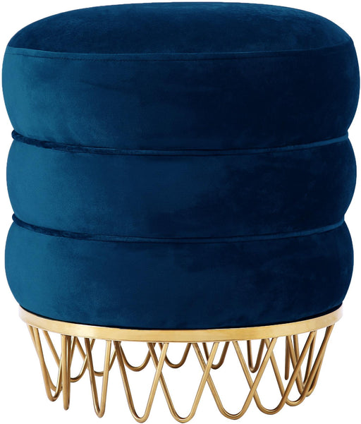 Add modern sophistication to your living space with this chic navy velvet Vino ottoman stool. Plush navy velvet curves are bound by a gold stainles...