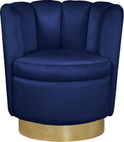 Spruce up your home with this elegant Lily Navy Velvet Accent Chair from Meridian Furniture. Its curved design and soft navy velvet upholstery give it a sophisticated appeal that complements your existing contemporary decor and home furnishing. A gold steel swivel base provides solid support, as well as freedom to turn and face whichever direction you choose while you curl up with a beloved book or in front of your favorite TV show.