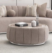 AICO Furniture Lucca Cocktail Table in Silver LFR-LUCA201-808. The Lucca Cocktail Table exudes understated luxury. Its round silhouette is elegantly dressed in a soft, channeled woven fabric, creating a warm juxtaposition with the sleek faux marble top. Nestled on a narrow silver base, it's a striking conversation starter, serving sophistication with every pour.