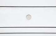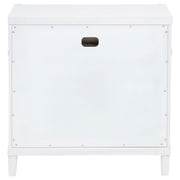This three-drawer nightstand blends subtle curves with thoughtful convenience. Vertical metal accents and brushed nickel pulls contrast a white finish, while the felt-lined top drawer includes discreet cord access for device charging. Built from solid rubberwood, engineered wood, and a smooth laminate veneer, it offers smooth drawer movement and refined bedside storage in a compact silhouette. Key Features: • Three-drawer nightstand with curved edges and clean profile for modern bedside storage • White finish pairs with brushed nickel pulls and sleek vertical tube accents • Top drawer includes felt lining, tinted interior, and hidden cord access for charging • Drawer boxes feature dovetail joints and glide on 45mm heavy-duty metal runners • Built from solid rubberwood, engineered wood, and smooth laminate veneer • Fully assembled nightstand includes tip-over restraint for dependable bedside use