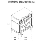 Keep all your bedroom essentials and wardrobe items neatly organized with this glam three-drawer nightstand. A contoured frame design features sparkling side panels flanking the three spacious drawers for a luxurious touch. A silver oak finished wood frame is accented further by modern glam metal knobs and bail handles that help slide each drawer with ease. A soft grey felt-lined top drawer invites you to store more delicate items. A hidden USB outlet creates a convenient charging area for handheld devices.