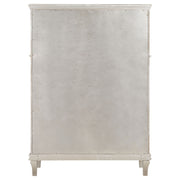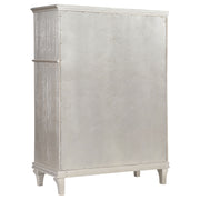 Elevate your guest room or main bedroom with this breathtaking glam chest. The space-saving tall design boasts a curvy front facade, seen throughout the wavy wood trim appointed drawer panels. Five spacious drawers offer ample space for all your bedroom necessities, along with a soft grey felt-lined top drawer for more delicate items. A silver oak finish covers the entire chest frame as slender glittering side panels lend a luxe modern flair. Hexagon-shaped knobs and hexagon-accented drop bail pulls offer a finishing touch.