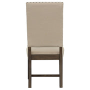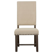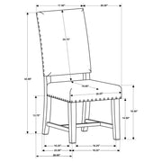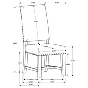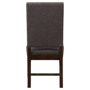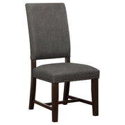 Simple, yet elegant Parsons chair is a welcome addition to your home. Regardless of décor, this side chair fits in seamlessly. Upholstered in sumptuous warm grey fabric. Characteristically armless for an easy getaway to the kitchen to check on your signature apple pie. Seat back is moderately flared, a welcome feature for leaning back when you've overindulged. Key Features: • Upholstered dining side chairs feature classic Parsons styling and armless design • Warm grey polyester fabric offers soft texture and neutral versatility • Moderately flared seat backs provide gentle support for relaxed dining • Bronze nailhead trim outlines seat and back for tailored visual detail • Crafted with solid rubberwood and foam cushioning for comfort and strength • Smokey black wood finish grounds the frame with a bold, refined contrast
