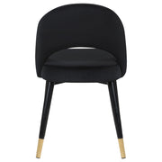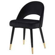 Add a touch of retro-inspired elegance to your dining room with this stylish dining side chair, featuring an elegant bucket-style seat that embodies Mid-Century modern charm. Wrapped in luxurious velvet, each chair provides a supportive, long-lasting seating experience, making it perfect for hosting dinner guests or enjoying a cozy meal. The flared, tapered legs, finished with dramatic gold-capped feet, add a regal Hollywood glam touch that enhances any dining space. This versatile chair effortlessly complements various color palettes and brings a bold statement to both formal and casual settings. Pull these chairs up to a spacious rectangular dining table to create an inviting and chic atmosphere for any gathering. _x005F_x000D_ Key Features: • Retro-inspired dining side chair with a sophisticated bucket-style seat • Velvet fabric upholstery offers a bold statement and complements diverse color palettes • Flared, tapered legs with gold-capped feet add a Hollywood glam touch • Supportive, long-lasting seat ideal for dinner guests and cozy meals • Perfect for Mid-Century modern, contemporary, and Hollywood glam decor styles • Ideal for dining rooms, cocktail nights, or as a stylish accent in any space