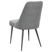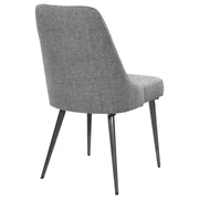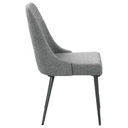 Channel mid-century charm with this armless side chair, wrapped in soft textured grey fabric. Its sleek wingback-inspired profile and gently tapered gunmetal legs bring a fresh, modern edge to dining spaces. Padded for comfort and built with durable materials, this chair offers a timeless silhouette that pairs effortlessly with a variety of table styles and finishes. Key Features: • Modern armless side chair with mid-century inspired wingback silhouette • Upholstered in textured grey fabric for a soft, sophisticated finish • Features slim, tapered legs in a sleek gunmetal finish for subtle contrast • Gently curved seat back provides ergonomic support and stylish appeal • Built with engineered wood frame, high-density foam, and heavy-gauge metal • Versatile design complements both casual kitchen nooks and formal dining rooms