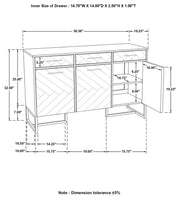 Elevate your space with this striking accent cabinet, blending natural wood tones with modern sophistication. Crafted from eco-friendly solid mango wood, the cabinet features a bold chevron pattern that adds depth and character. A sleek marble top offers a luxurious touch, while antique gold-finished metal legs and pull handles enhance its contemporary appeal. Designed for both style and storage, it includes three drawers and three spacious cabinets with interior shelving, making it perfect for entryways, dining rooms, or living spaces.
