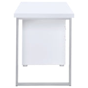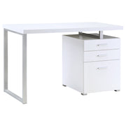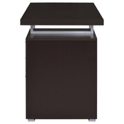 Streamline your workspace with this modern office desk that combines function and style. Supported by a sturdy silver metal frame, the design features a spacious work surface along with two storage drawers and a file cabinet that accommodates both legal and letter-sized documents. A reversible configuration allows you to set up the storage pedestal on either side, providing flexibility for any layout. Crafted with engineered wood and laminate veneer, this desk balances durability with sleek contemporary appeal._x005F_x000D_ Key Features: • Cappuccino office desk with modern design and silver finished metal framework • Reversible configuration allows storage pedestal on either left or right side • Includes two storage drawers and one file cabinet for organized workspace use • File cabinet accommodates both letter size and legal size document storage • Crafted with engineered wood and laminate veneer for everyday durability • Large work surface provides ample room for writing, studying, or computing