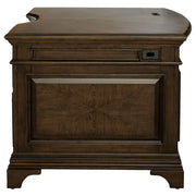 Feel like a CEO every day you sit down on this exquisite executive desk. Finished in burnished oak, it provides a traditional stylish flair to your office space. Two felt-lined top drawers allow you to store small items while you lock valuables inside the two built-in filing cabinets. Removable dividers help keep your area extra organized. With beautiful wood paneling on the frame, this wood executive desk will help your workday breeze by with its spectacular style and function. Key Features: • Executive desk in burnished oak with seven total storage drawers • Two felt-lined top drawers and two lockable file drawers included • Antique brass hardware complements traditional framed detailing • Removable dividers offer flexible organization for accessories • Center drawer ideal for keyboard or writing tools in daily use • Constructed with engineered wood, oak veneer, and hardwoods