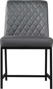 Give your dining room a revamp with this Bryce Faux Leather Dining Chair from Meridian Furniture. This handsome chair features an armless design with heavily padded seat and back cushions, ensuring that guests stay comfortable all the way through dessert. The back is quilted for added aesthetic appeal, and it's upholstered in grey faux leather for the luxury look of leather without the maintenance requirements. A metal frame and matte black metal legs complete the look and provide sturdy support.