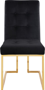 Elevate your dining experience with this Pierre black velvet dining chair. A boxy geometric shape makes this chair an uber modern addition to your space, while a base of stainless steel makes it durable and tough, so it holds up to heavy daily use. The gold tone finish on the base contrasts nicely with the black velvet upholstery used on the seat and back. Heavy tufting adds to the rich appeal of this beautiful design.