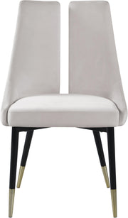 It doesn���t get more modish than this! This Sleek velvet dining chair is the bees knees when it comes to contemporary design with its sculptural back and its clean lines. The chair is covered in soft cream velvet upholstery material for a look that���s modern and sophisticated. Matte black iron legs with gold tips gives the chair a hint of elegance.