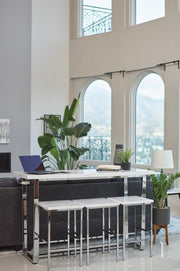 Stylish and versatile, this counter height table set exudes modern elegance. From kitchens to living rooms to rec rooms and more, it's perfect for adding extra seating and table space to any room in your home. The table is crafted with a scratch-resistant surface made from beautiful, white faux marble. The sleek, angular frames are crafted of metal in a gleaming chrome finish for a gorgeous touch of polish. This stunning set comes with one table and three stools to instantly complete your space.