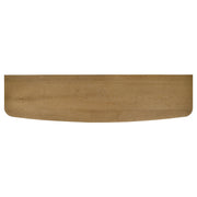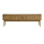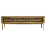 With graceful curves and rich texture, this mid-century inspired media console becomes an understated centerpiece. Reeded sliding doors ripple gently across the front, adding quiet rhythm to its softened silhouette. The weathered natural finish warms the room like sunlight through wood grain, while open shelving within offers thoughtful space for your favorite pieces. Crafted from solid rubberwood and engineered wood, and perched on tapered legs, it brings both elegance and ease to any curated living space. Key Features: • TV stand media console holds televisions up to 75 inches with stable, spacious top • Reeded sliding doors provide textural movement and conceal open shelving • Softly curved front and rounded corners offer a sculptural, mid-century profile • Interior shelves store media components, décor, or entertainment accessories • Back panel includes cord management cutouts for a clean, organized setup • Crafted from solid rubberwood and engineered wood in a weathered natural finish