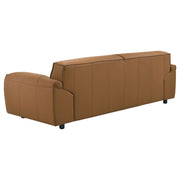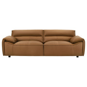 Refined and sculptural, this leather sofa set blends modern minimalism with deep, enveloping comfort. Upholstered in 100% genuine top grain leather, each piece features wide, gently sloped arms and a low-profile frame that grounds the room with effortless presence. Deep seat cushions are filled with high-density full foam and supported by sinuous springs, creating a balanced feel that’s both structured and soft. Tailored yet inviting, this two-piece set is crafted to elevate comfort with enduring sophistication. Key Features: • Two-piece sofa set includes a full-size sofa and loveseat with sculpted low-profile silhouettes • Upholstered in 100% top grain leather for breathable softness and lasting luxury • Wide, gently sloped arms offer relaxed comfort with a modern architectural edge • High-density full foam cushions provide deep, plush seating with durable structure • Sinuous spring seat foundation ensures consistent support and responsive comfort • Orange leather finish adds bold contrast and timeless character to any space