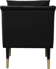 Personify elegance in your living area, den or great room with this Elegante velvet chair. The chic, sleek black velvet upholstery covering this chair is uber soft and comfortable, ensuring that it feels great against your skin. Wooden legs provide sturdy support and are painted black and topped with gold caps for a svelte finish to this exceptionally contemporary chair.
