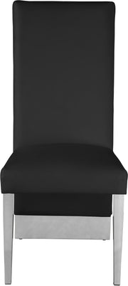 Bring the luxe look of this Porsha chair to your dining space. Impressing guests is simple when they're seated in this chair. The floor-length back is elegantly beautiful and creates a striking silhouette from every angle. Faux Leather upholstery material in a sophisticated hue of black adds a touch of modernity to this chair, and the reverse is channel tufted for added elegance and refinement. Gold legs complete the look for added contemporary panache and sturdy support.