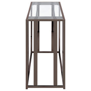 This modern rectangular console table features a clear tempered glass top paired with a geometric base crafted from heavy-gauge metal with a sleek electroplated finish. The open design creates a contemporary aesthetic, offering both elegance and durability. Ideal for placement in entryways, hallways, or behind sofas, this console table provides a spacious surface for displaying decor or organizing essentials. Its scratch-resistant materials ensure long-lasting quality with easy maintenance.