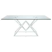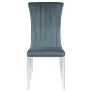 This glamorous five-piece dining set comes complete with a long table and four chairs. A stainless steel base is polished to a lustrous chrome finish, topped by a thick tempered glass tabletop with a timeless beveled edge. Each chair features a rolled back with channel tufting for an Art Deco vibe. In addition, each retro style chair is wrapped in a soft dark grey velvet with chrome finish legs that match the table base. Place this gorgeous table set in a contemporary dining room for an elegant dining experience.