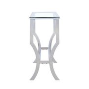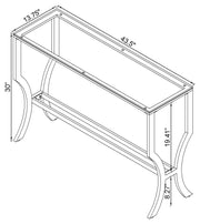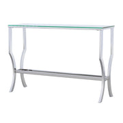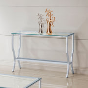 Add modern sophistication to your home with this sleek rectangular console table. Featuring a clear tempered glass top and a matching lower shelf, it offers ample space for storage or display. The elegant curved legs and open design enhance its airy, contemporary feel, while the electroplated polished chrome frame ensures durability and style. Perfect for hallways, entryways, or behind a sofa, this console table blends functionality with a striking modern aesthetic.