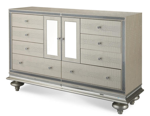 Hollywood Swank Collection by Aico Furniture Crystal Croc finish Chrome accents Crystal knobs Velvet-lined drawers 2 Doors 8 Storage drawers Int...