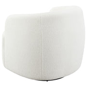 Covered entirely in a plush faux sheepskin material, this swivel chair invites you to curl up and relax. Rotating a full 360 degrees, this accent chair is perfect for open floor plans and versatile spaces. The vintage-inspired barrel-like design offers ultimate support with a tailored, tight seat and a rounded, low-profile backrest that wraps into the arms toward a slight taper. A flush base keeps the swivel mechanism discreetly hidden and offers a sleek profile. The light hue of the faux sheepskin also makes this furniture piece easy to coordinate within a space.