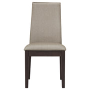 Graceful and comfortable, these upholstered dining chairs bring refined style to any dining room. A gently contoured high backrest offers ergonomic support, while a softly cushioned seat enhances comfort during long meals and gatherings. The clean, minimalist silhouette and espresso-finished wood legs create a versatile look that pairs effortlessly with modern or transitional décor. Crafted from solid rubberwood and upholstered in durable fabric, these chairs blend everyday functionality with timeless design. Key Features: • Upholstered dining chair with contoured backrest for refined support • Chocolate brown fabric upholstery adds inviting warmth and depth • Espresso finish wood frame complements transitional dining spaces • Padded seat and back offer comfort through extended gatherings • Solid rubberwood frame ensures long-lasting durability and strength • Versatile design suits both formal and casual dining arrangements