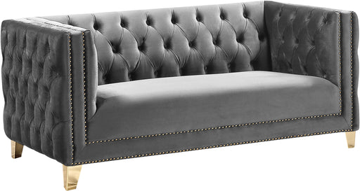 Upholstered in soft grey velvet, this Michelle love seat is sumptuously glamorous. Designed for upscale living, this chair features rich gold nail ...