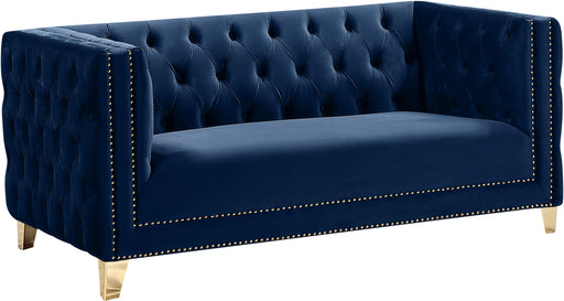 Upholstered in soft navy velvet, this Michelle love seat is sumptuously glamorous. Designed for upscale living, this chair features rich gold nail ...