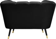 Sink your body into the inviting comfort of this Beaumont velvet chair. Upholstered in a soft shade of black with black metal legs tipped in gold, this chair oozes modern charm and up-to-the-minute comfort. The heavily stuffed arms, seat and back are bound to beckon at day���s end for you to sit and relax. Deep channel tufting on the back and arms adds to its uber welcoming look. Pair it with the matching pieces in the same collection for cohesive beauty.