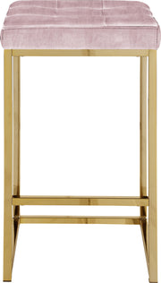 Give your home bar or kitchen counter a fast update with this Nicola Pink Velvet Counter Stool. A glitzy gold-finished base made from steel gives ample support and resilient strength to this stool's design, ensuring it lasts and lasts in your busy home. Fun pink velvet upholstery covers the plump seat cushion, ensuring comfort till 'closing time,' and tufting on the seat keeps the thick cushion inside aloft while adding to its elegant modern demeanor. A foot rail on the base gives you somewhere to rest your feet while you sit and relax.