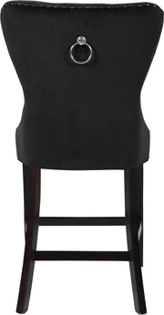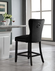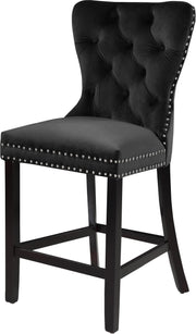 Lounge in luxurious style with the Nikki black velvet counter stool. Featuring a curved high back, plush cushioned seat and deep tufted black velvet upholstery studded with chrome nailheads, this counter stool is sure to take your dining experience to a whole new level. Espresso wood legs provide sturdy support and complement the stunning black upholstery for a sleek, contemporary design.