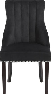 Dine in luxurious style with the Oxford velvet dining chair. Featuring a curved high back, plush cushioned seat and deep tufted velvet upholstery studded with chrome nailheads, this dining chair is sure to take your dining experience to a whole new level. Espresso wood legs provide sturdy support and complement the stunning upholstery for a sleek, contemporary design.