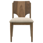 Stylish charm infuses a modern five-piece dining table set to create a welcoming centerpiece in your dining room. The set delivers a round wood table paired with four chairs to create the perfect spot for meals with the family, homework, and game nights. The table stands on four round post legs with an X-cross base that adds movement and eye-catching flair. Chairs offer impeccable comfort with foam seat cushions and beige upholstery paired with wooden backs complete with wedge cutouts that lighten the overall look and feel. This charming set is the perfect choice for an inviting family space.
