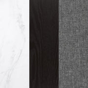 Bring together family and friends at this modern rustic style dining table set. The table features a rectangular, thick, white marble top that is spacious enough for six people. Sleek open and airy trestle base with a center punch out, rustic espresso striking color combination lends a dramatic touch and grounds the room elegantly. The set of chairs with a rolled backrest with button-tufted details lends a traditional aesthetic to a space. Also, bringing to your home the classic elements is a padded seat with individual nailhead trim that offers a charming detail.