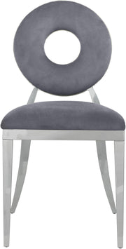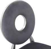Yield to the decorator within when you bring home this Carousel velvet dining chair. This chair features a metal frame and legs finished in gold stainless steel for a modern touch, but the real star of the show is the donut-shaped seat back that exudes undeniable contemporary charm. The seat and back are both plumply filled for comfort and upholstered in soft grey velvet for a chic look.