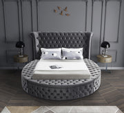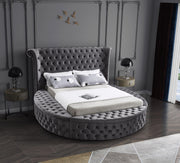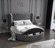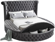 Marvel at the remarkable beauty and graceful lines of this round Luxus grey velvet king size bed. The headboard, footboard and side rails are all adorned with deep button tufting, and there is nailhead trim on both sides of the tall headboard. The footboard and side rails all contain ample storage and seating, making it easy to sit down in comfort so you can put on your pants or shoes.