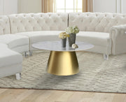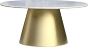 Entertain friends in sophisticated style around this Sorrento coffee table. The round shape ensures everyone can see and hear each other in conversation. The genuine marble top helps prevent damage from cups, dishes or other items being pushed or placed on the table. The cone-shaped brushed gold base gives the top a sturdy foundation while the illustrious color wows guests who see it. The base is large enough to ensure cups at the edge can't fall off. Place this beautiful table in your favorite space with chairs around it and enjoy good company.