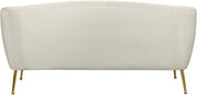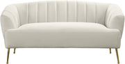 Dress up your living room space with this Tori Velvet Loveseat. This plush loveseat features chic cream velvet upholstery that covers every square inch, adding a sumptuous and svelte look to your room. The gold legs with a ball design on the foot adds to the elegant look of this pretty chair, and deep channel tufting adds loft to the back and arms for a lavish feel when you sit down to relax and unwind at day���s end.