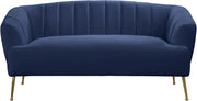 Dress up your living room space with this Tori Velvet Loveseat. This plush loveseat features sleek navy velvet upholstery that covers every square inch, adding a sumptuous and svelte look to your room. The gold legs with a ball design on the foot adds to the elegant look of this pretty chair, and deep channel tufting adds loft to the back and arms for a lavish feel when you sit down to relax and unwind at day���s end.